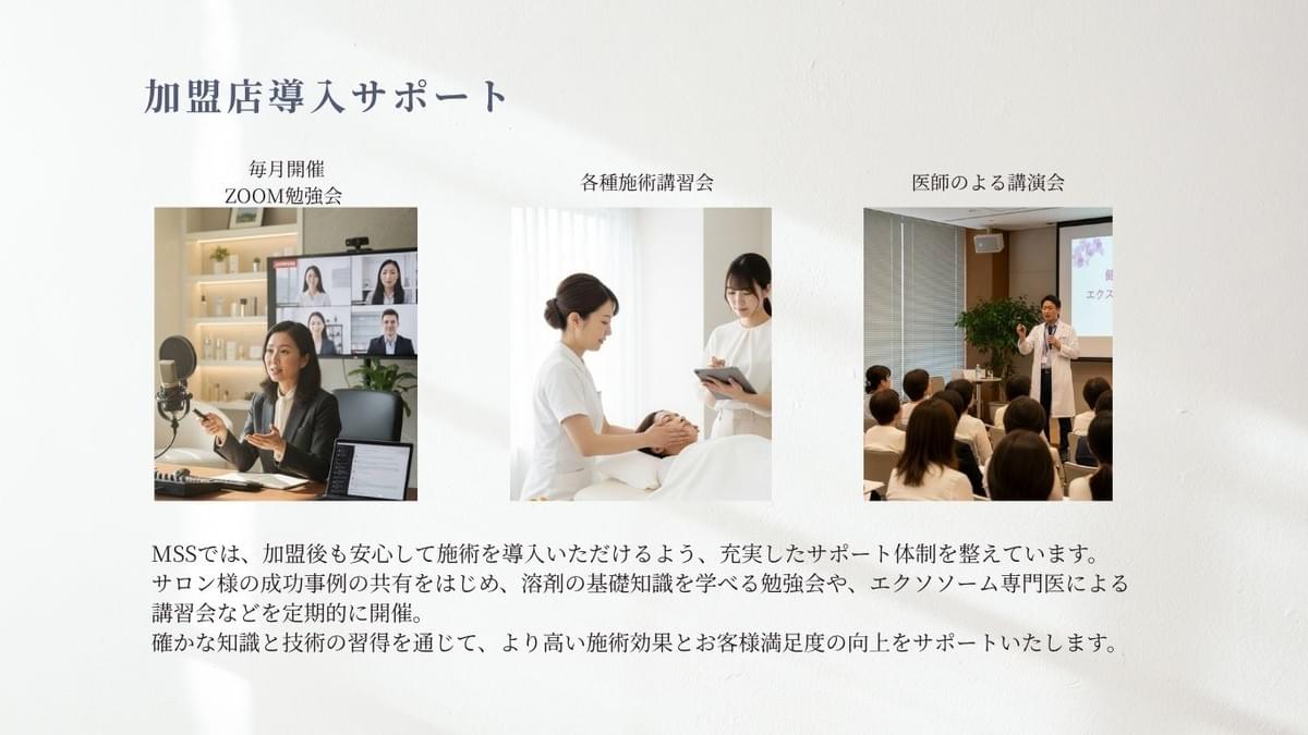 ご加盟後のサポートはもちろんのことに、信頼性の高い美容ケアを提供していただけるように、